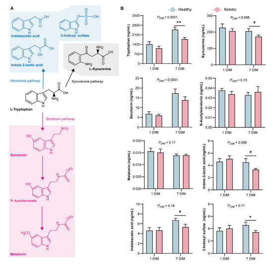 Tryptophan (Trp) metabolism in dairy cows during the ketosis event. (A) Diagram of Trp metabolism pathway, including kynurenine, serotonin, and microbiota pathways. (B) Levels of Trp and its main metabolites between the healthy and ketotic groups at 1 and 7 days in milk (DIM). 0.05 ≤ # p < 0.1, * p < 0.05, and ** p < 0.01.