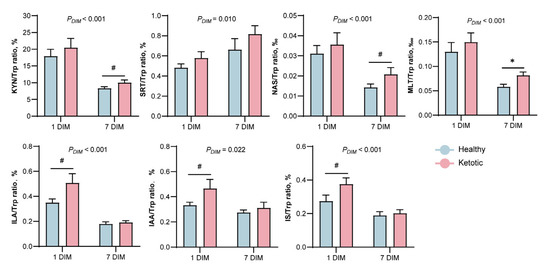 Ratios of individual metabolites to Trp between the healthy and ketotic dairy cows. Trp, tryptophan; KYN, kynurenine; SRT, serotonin; NAS, N-acetylserotonin; MLT, melatonin; ILA, indole-3-lactic acid; IAA, indoleacetic acid; IS, 3-indoxyl sulfate. 0.05 ≤ # p < 0.1, * p < 0.05.