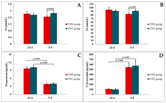 Concentrations of (A) triiodothyronine (T3), (B) thyroxine (T4), (C) progesterone, and (D) 17-β estradiol in serum of CON and CNT groups of cows at 25 and 5 days before expected parturition. Values are expressed as mean ± SE. (A) Effects of treatment (p = 0.332), time (p = 0.754), and interaction between treatment and time (p = 0.050); (B) effects of treatment (p = 0.532), time (p = 0.151), and interaction between treatment and time (p = 0.050); (C) effects of treatment (p = 0.742), time (p < 0.001) and interaction between treatment and time (p = 0.753); (D) effects of treatment (p = 0.540), time (p < 0.001), and interaction between treatment and time (p = 0.531). Significant differences between groups as well as differences along the time points within each group are indicated by p values (Fisher post hoc test). −25 d = first day of chestnut tannins supplementation (25 ± 2 days before parturition). −5 d = 5 days before parturition.