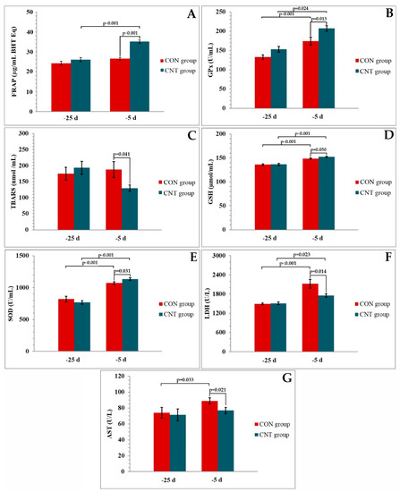Activities of (A) total antioxidants (FRAP), (B) glutathione peroxidase (GPx), (E) superoxide dismutase (SOD), (F) lactate dehydrogenase (LDH), and (G) aspartate aminotranspherase (AST), and concentrations of (C) thiobarbituric acid reactive substances (TBARS) and (D) reduced glutathione (GSH) in serum of CON and CNT groups of cows at 25 and 5 days before expected parturition. Values are expressed as mean ± SE. (A) Effects of treatment (p < 0.001), time (p < 0.001), and interaction between treatment and time (p < 0.001); (B) effects of treatment (p < 0.01), time (p < 0.001), and interaction between treatment and time (p = 0.687); (C) effects of treatment (p = 0.100), time (p = 0.300), and interaction between treatment and time (p = 0.221); (D) effects of treatment (p = 0.271), time (p < 0.001), and interaction between treatment and time (p = 0.291); (E) effects of treatment (p = 0.613), time (p < 0.001), and interaction between treatment and time (p = 0.020); (F) effects of treatment (p = 0.121), time (p < 0.001), and interaction between treatment and time (p = 0.043); (G) effects of treatment (p = 0.064), time (p = 0.101), and interaction between treatment and time (p = 0.133). Significant differences between groups as well as differences along the time points within each group are indicated with p-values (Fisher post hoc test). −25 d = first day of chestnut tannins supplementation (25 ± 2 days before parturition). −5 d = 5 days before parturition.