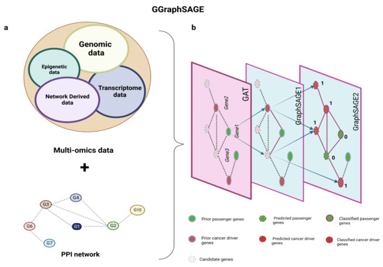 Schematic diagram of GGraphSAGE framework. (a) Inputs of GGraphSAGE framework include multiomics data (transcriptomic, genomic, and epigenetic data) and network and network-derived data; (b) all features and the PPI network are used for the semisupervised training of cancer driver genes. During the training of the GGraphSAGE model, the features are compressed by a three-layer graph aggregate operation and gradually include an increasingly wide range of neighboring nodes. The final output is determined by a probabilistic model (of whether it is a cancer driver gene).