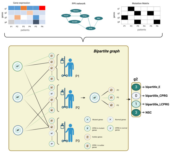 Bipartite graph architecture. For each tumor type, we built a bipartite graph by gene expression data, mutation data, and PPI network. We finally output a 4 × n dimensional feature matrix (n is the number of genes to be predicted). The left partition of the bipartite graph is the mutated genes, and the right partition of the bipartite graph is the outlying expression status for each tumor sample. represents the number of edges of a mutated gene; denotes the number of edges of a mutated gene linked to CPRGs; is a binary number: if a gene was a CPRG, we set the feature of the gene as 1, otherwise 0; NSC is the number of patients covered by a mutated gene.