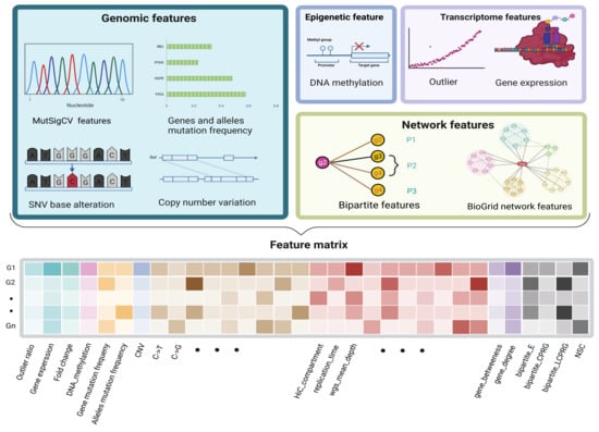 A gene’s features consist of its original multiomics information and network features derived from the PPI and BioGrid network. For each gene, for the transcriptome level, we computed the genes’ average expression and outlier ratio; for the genome level, we counted the mutation frequency, CNV, base transition frequency, variant allele fraction, and mutational heterogeneity signatures obtained from MutSigCV; for the epigenome level, we calculated the genes’ average methylation. For biomolecular networks, we combined the biological network and the genomic and transcriptomic data in a bipartite graph. Four bipartite graph features were extracted for each candidate gene (Figure 2). Two network features were calculated by the BioGrid network. The values of each feature of different scales were normalized by row before being joined into a feature matrix (Figure 3).