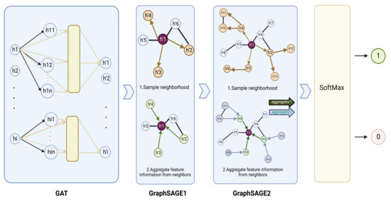 GraphSAGE aims to improve the efficiency of a GCN and reduce noise. It learns an aggregator rather than the representation of each node, which enables one to accurately distinguish a node from its neighborhood information. In addition, it can be trained in batches to improve the polymerization speed. Compared with a GCN, GraphSAGE was more flexible and suitable for our semisupervised task. The GraphSAGE algorithm is formulated as follows: