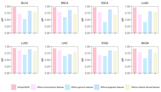 The proposed semisupervised deep graph learning framework GGraphSAGE was constructed using a GAT layer and two GraphSAGE layers, where it took the PPI network as the graph and each gene on the PPI network as a node. The advantage of GGraphSAGE is that it aggregates the neighborhood information in the graph more reasonably. The GAT quantifies the differences in interactions between homologous partners in biological large-scale networks by aggregating the weights of adjacent edges. At the same time, by sampling from the inside out and aggregating from the outside of GraphSAGE, using “concat” instead of “average”, it can better distinguish the information of itself from its neighbors. We used the generated feature matrix and PPI networks as inputs, which allowed GGraphSAGE to receive both multiomics information and molecular interactions in biological systems. It also greatly helped to improve the overall performance of the model (Figure 4).