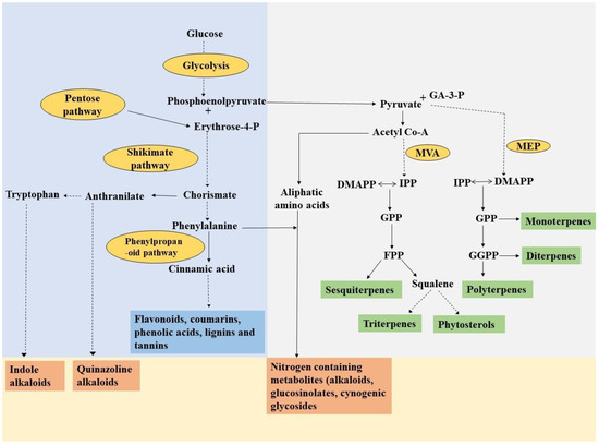 These secondary metabolites frequently exhibit multiple functionalities and typically contain more than one functional group. Even though secondary metabolites are structurally diverse compounds, they are derived from limited products of primary metabolism [1]. Broadly, secondary metabolites are classified into three groups, phenolics, terpenoids and nitrogen-containing compounds (Figure 1). Terpenoids are synthesized by the plastidic MEP (methylerythritol phosphate) and cytosolic MVA (mevalonic acid) pathway, which utilizes dimethylallyl pyrophosphate (DMAPP) and isopentenyl pyrophosphate (IPP) moieties, respectively, which serve as fundamental building blocks of all isoprenoids. The MEP pathway leads to the generation of mono, di, tetra and polyterpenes, while the MVA pathway results in the synthesis of sesquiterpenes, triterpenes and phytosterols [4,14]. Another important group of secondary metabolites is phenolics which are generally divided into five subgroups, flavonoids, phenolic acid, lignin, coumarins and tannins. Phenolics are synthesized through the phenylpropanoid pathway by utilizing phenylalanine as a key precursor molecule, which in turn is synthesized via the shikimic acid pathway by the reaction of erythrose-4-phosphate and phosphoenolpyruvate (Figure 1). Nitrogen-containing metabolites are also one of the potential groups of secondary metabolites including alkaloids, cyanogenic glycosides and glucosinolates.