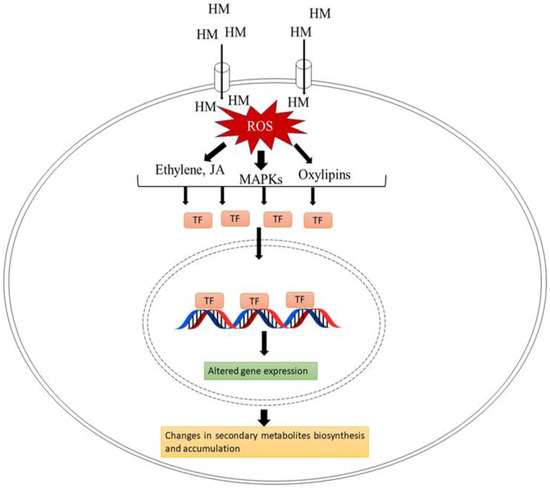 In addition, enhanced ROS production causes peroxidation of polyunsaturated fatty acids (PUFA) of membranes, which eventually leads to the production of extremely active signaling molecules. Fatty hydroperoxide production results in the production of oxylipins (oxygenated fatty acids), which is a group of active signaling molecules that support plant defense responses and activate genes taking part in the synthesis and accumulation of secondary metabolites [12,56]. Heavy metals are also very well known to activate the expression of other signaling molecules. It was found that in Ag+-exposed hairy root cultures of Brugmansia candida ethylene play a role in the regulation of pathways that results in the formation of tropane alkaloids (hyoscyamine and scopolamine) [56]. Figure 3 shows a diagrammatic illustration of the signaling pathway involved in heavy metal-induced secondary metabolite accumulation.