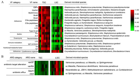 Relative abundances of virulent factors (VFs) and antibiotic resistance genes (ARGs) enriched in TSC and LSC. Only significantly enriched (A) VFs and (B) ARGs in TSC and LSC are shown (LDA > 2, p-value < 0.01 in LEfSe analysis, and abundance fold changes >1.5 or <0.67). Heatmaps show the relative abundances of VFs and ARGs, with the most abundant being defined as 1. The potential microbial sources of each VF or ARG were identified by searching all sequences against the NCBI-NT databases. The three most abundant microbial sources are listed in the table as the main sources of the VFs/ARGs.