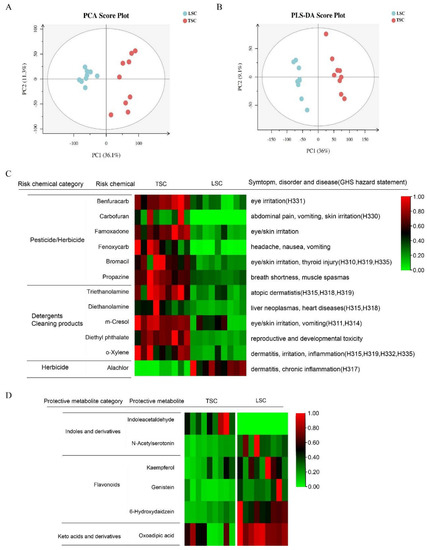 Variation of metabolites/chemicals in TSC and LSC. (A) Principal Component Analysis (PCA) and (B) Partial Least Squares Discriminant Analysis (PLS-DA) plots of aircraft metabolites/chemicals. (C) Risk chemicals and (D) protective metabolites enriched in TSC and LSC (p < 0.01, FDR < 0.1 and fold change >2). The relative abundance is displayed, with the highest value set as 1 in each line, and the remaining values calculated as ratios. The potential risk chemicals were defined as those associated with symptoms, disorders, and diseases according to Pubchem, or having GHS hazard codes between H300 and H336 (airway, skin, and eye irritation). These chemicals were mostly synthetic. Protective metabolites, including flavonoids, isoflavonoids, indoles, and keto acids, were identified based on previous studies. Chemicals annotated as drugs were excluded from the table. H311: Toxic in contact with skin; H314: Causes severe skin burns and eye damage; H315: Causes skin irritation; H317: May cause an allergic skin reaction; H318: Causes serious eye damage; H319: Causes serious eye irritation; H330: Fatal if inhaled; H331: Toxic if inhaled; H332: Harmful if inhaled; H335: May cause respiratory irritation. Potential risk chemicals in TSC and LSC were defined as those with GHS hazard codes (H300 to H336) or having adverse symptoms, disorders, and diseases, as found in Pubchem and Pubmed. Eleven potential risk chemicals were identified in TSC, while only one was found in LSC (Figure 3C; Table S3). The risk chemicals in TSC included six pesticides/herbicides (benfuracarb, carbofuran, fenoxycarb, bromacil, propazine, and famoxadone) and five detergent and cleaning product chemicals (triethanolamine, diethanolamine, m-cresol, diethyl phthalate and o-xylene). These chemicals can cause symptoms such as eye and skin irritation, vomiting, headache, inflammation, and dermatitis. Furthermore, m-cresol, triethanolamine, and o-xylene are considered potential human carcinogens according to assessments from the Integrated Risk Information System (IRIS) and the Carcinogenic Potency Database (CPDB) [24]. In LSC, only one potential risk chemical, alachlor (an herbicide), was identified, with adverse health effects including chronic inflammation and skin irritation.