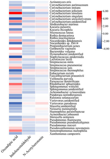 Our epidemiological survey in Malaysia and Shanghai revealed that the presence of indoor indoles, keto acids, and flavonoids was protective against the prevalence of asthma and rhinitis [25]. Further molecular experiments showed that these metabolites could reduce inflammation and oxidative stress [26,27,28]. Therefore, we considered them to be potential protective metabolites, and compared their concentrations in TSC and LSC. Indoleacetaldehyde, a derivative of indole, was found to be enriched in TSC (Figure 3D, Table S4). Conversely, LSC was enriched with one indole derivative (N-acetylserotonin), three flavonoids (kaempferol, genistein, and 6-hydroxydaidzein), and one keto acid derivative (oxoadipic acid), suggesting that LSC contains a higher concentration of protective metabolites than TSC. Flavonoids are secondary metabolites from various plants, while keto acid and indole derivatives can be produced by microorganisms. To determine the relationship between these metabolites and the top 50 cabin microorganisms, we conducted a neural network co-occurrence probability analysis (Figure 4). The results indicated that several cabin microorganisms, including Corynebacterium, Nocardiodes, Streptococcus, Sphingomonas, and Pseudomonas co-occurred with oxoadipic acid, indoleacetaldehyde, and N-acetylserotonin, implying that these microorganisms may be responsible for producing these protective metabolites.