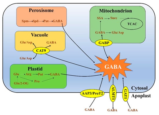 GABA is widely distributed in the cytoplasm and various organelles of plant cells, such as mitochondria, vacuoles, peroxisomes and other plastids [1,17] (Figure 1). However, GABA performs different metabolic processes in different organelles. GABA catalysed by glutamate decarboxylase is found in the cytoplasm [22,23]. In mitochondria, GABA is converted to succinate through the GABA shunt [24] and ultimately enters the tricarboxylic acid (TCA) cycle or another metabolic pathway to produce γ- hydroxybutyric acid [25,26]. In addition, GABA can also be converted to glutamate and aspartate (Asp) in the mitochondria [27]. GABA produced by the polyamine degradation pathway is distributed in peroxisomes, where the transformation from spermidine to spermine and from spermine to putrescine takes place [28,29]. Johnson et al. [30] found that the amount of amino acids (including GABA) accumulated in tomato fruit was relatively high and mainly stored in the vacuole. GABA is also distributed in some plastids, in which glutamine (Gln) and 2-ketoglutarate (2-OG) are synthesized by glutamine synthetase and ferredoxin-dependent glutamate synthetase, respectively [31], after which GABA is generated by two reactions: in one reaction, glutamate generates arginine through the urea reaction, arginine decarboxylates to form putrescine, and putrescine generates GABA through copper amine oxidase and aldehyde dehydrogenase (ALDH10A8) [32]; in the other reaction, glutamate is converted to proline through ∆ 1-pyrroline-5-carboxylate synthetase and ∆ 1-pyrroline-5-carboxylate reductase, and then proline decarboxylates spontaneously to form pyrrolidine-1-yl (Pyr·), which is easily converted to Δ 1-pyrroline/4-aminobutyraldehyde; these products are then converted to GABA under the action of aldehyde dehydrogenase [33].
