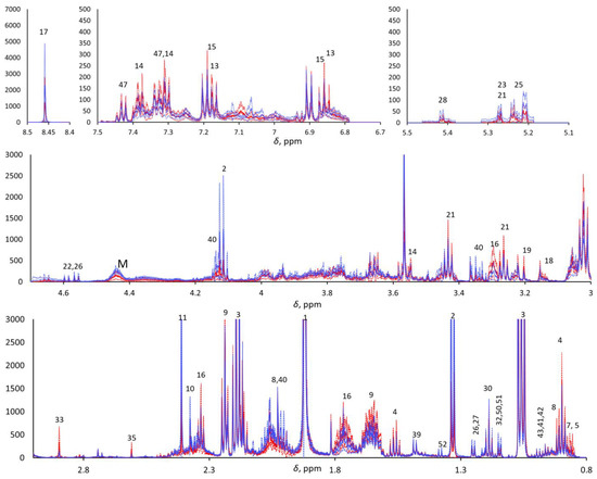 Five enlarged regions of the mean pSS (continuous red line) and mean HC (continuous blue line). 1H CPMG NMR spectra (±standard deviations, dotted lined; red and blue for pSS and HCs, respectively). M indicates macromolecules.