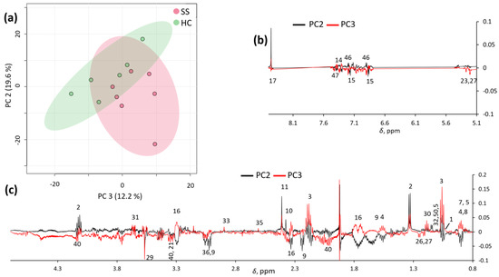 Unsupervised exploratory PCA was also conducted on the spectra, and partial clustering was observed, especially in the PC2/PC3 score plot (Figure 2a). These two principal components explained 19.6% and 12.2% of the total variance, respectively. Inspection of the PC2 and PC3 loadings (Figure 2b) confirmed that pSS samples were characterized by a number of metabolites (as reported in Supplementary Table S1), which potentially allow for their discrimination from HC samples.