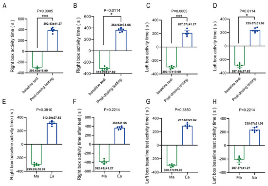 Figure 1. Addictive behavior of Methamphetamine-administered mice, setting the right box as the companion box. (A) Right box activity time of mice in group Ma; (B) Right box activity time of mice in group Ea; (C) Left box activity time of mice in group Ma; (D) Left box activity time of mice in group Ea; (E) Right box baseline activity time of mice in group Ma versus Ea; (F) Right box test activity time of mice in group Ma versus Ea; (G) Left box baseline activity time of mice in group Ma versus Ea; (H) Left box test activity time of mice in group Ma versus Ea. * Indicates post-dosing versus baseline level, p < 0.05; *** indicates post-dosing versus baseline level, p < 0.001.