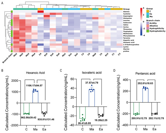 Figure 4B–D show that the SCFAs had opposite trends after MA administration and locomotor intervention. Results showed that only hexanoic acid (p [Ma/C] = 0.01, p [Ea/Ma] = 0.03; Figure 4A), isovaleric acid (p [Ma/C] = 0.01, p [Ea/Ma] = 0.00; Figure 4B), and pentanoic acid (p [Ma/C] = 0.00, p [Ea/Ma] = 0.00; Figure 4C) showed opposite trends, whereas acetic acid (p [Ma/C] = 0.00, p [Ea/Ma] = 0.00) had the same trend after MA administration and exercise intervention. Butyric acid, isobutyric acid, and propionic acid showed no significant differences between groups Ma and C (p > 0.05), but those in group Ea were lower than those in group Ma (p < 0.05). Details are shown in Table 3.