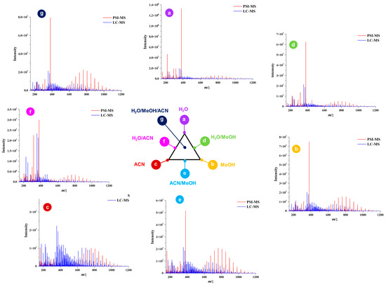 Comparison of chemical profiles obtained by paper spray ionization–mass spectrometry (PSI-MS) and liquid chromatography–mass spectrometry (LC-MS) for the different extraction solvents.