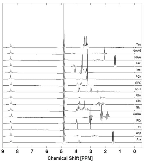 A total of 16 metabolite samples (e.g., alanine (Ala), N-acetylaspartate (NAA), N-acetylaspartylglutamate (NAAG), creatine(Cr), phosphocreatine (PCr), phosphoryl-choline (PCh), glycerol-phosphoryl-choline (GPC), taurine (Tau), Glu, Gln, GSH, Ins, GABA, Asp, lactate (Lac), and glucose (Glc)) were purchased from Sigma-Aldrich (Sigma-Aldrich Korea Ltd. (Seoul, Republic of Korea), SIAL) and used to generate the experimental basis set. Types and quantities of metabolites used in the study were determined according to the LCModel manual (http://s-provencher.com/lcm-manual, accessed on 1 November 2013). Each metabolite was dissolved in a standard chemical solvent. When using NaOH and HCl, solvent pH was adjusted to 7.2 and experiments were performed at room temperature.