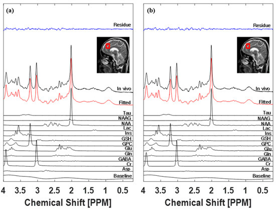 LCModel spectral fitting results with (a) and without (b) in-house basis sets. Fitting residue, VOI with sagittal T2 image, in vivo, fitted, individual spectra, and baseline are represented with names.