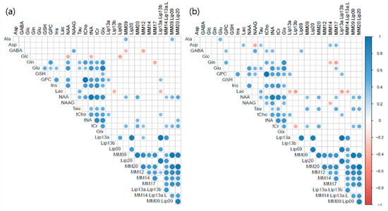 Figure 4 shows the correlation matrices of metabolite and macromolecules concentrations, as quantified using both basis sets basis. The blue colors indicate positive correlations, red colors indicate negative correlations, and blanks indicate no significant correlations. Before thresholding, Figure 4a (left, the in-house experimental basis set) and Figure 4b (right, the provided simulated basis set) showed very similar patterns, and we could not find any noticeable differences between the two matrices; thus, we adjusted significant level of the P value to 0.1. There were negative correlations in the left matrix between GABA and MM09, GABA and MM12, Glc and NAA, Glc and tNA, Glc and Lip09, Gln and MM17, Lac and Lip13b, and Lac and Lip13a + Lip13b. On the other hand, there were inverse correlations in the right matrix between Asp and NAAG (p = 0.051), Gln and MM14, Gln and MM17, Lac and Lip13a, Lac and Lip13b, Lac and Lip13a + Lip13b, Lac and MM14 + Lip13a + Lip13b + MM12, tCr and Lip13b.