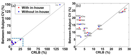 Coefficients of variation (CV) vs. CRLB and its zoomed Figure. (a) emphasizes that the CRLB of Asp using without in-house basis sets is remote from others. (b) shows that quantified metabolites are distributed within the CRLB < 35% and above.