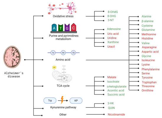 As described above, changes in the brain’s energy metabolism may result in deterioration in the peripheral concentration of its related metabolites. Through metabolomic studies, changes in amino acids (alanine, β-alanine, cysteine, L-glutamine, methionine, histidine, valine, asparagine, aspartic acid, glycine, isoleucine, lysine, phenylalanine, serine, tyrosine, tryptophan, threonine, ornithine, uracil), as well as TCA cycle metabolites (malate, isocitrate, and α-ketoglutarate), oxidative stress indicators (3-Nitrotyrosine, 8-hydroxyguanosine), and other metabolites (linked with purine and pyrimidines metabolism like adenosine, uric acid, xanthine and uridine, or kynurenine pathway like 3-hydroxyquinurenine) were highlighted in Alzheimer’s disease patients [86,87,88,89] (Figure 2).