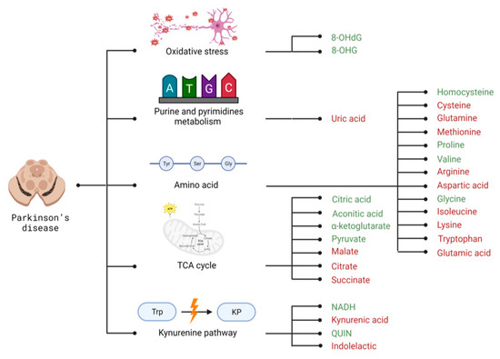 Biomarkers of PD related to energy metabolism disruption (green—increased levels, red—decreased levels).