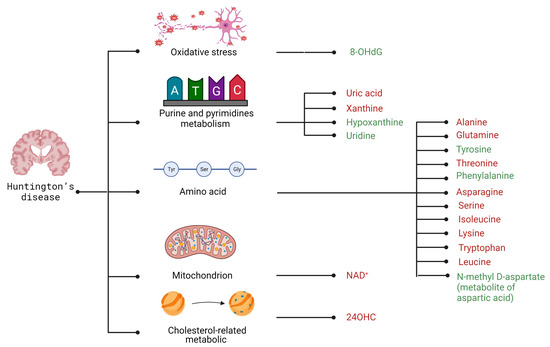 Biomarkers of HD related to energy metabolism disruption (green—increased levels, red—decreased levels).
