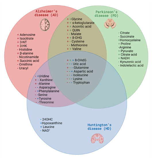Common metabolites for AD and HD disease are uridine, xanthine, alanine, asparagine, phenylalanine, serine, tyrosine, and threonine. In both AD and HD patients, a decrease in levels of asparagine, serine, and threonine is observed, while in AD a decrease in levels of xanthine and alanine is observed in HD. In the levels of the others, an inverse relationship is observed with an increase in levels of HD and a decrease in AD. Interestingly, the most similar metabolomics footprint is observed in AD and PD (the exception is cysteine, which increases AD and decreases PD), while no related metabolites are observed between PD and HD. Although AD and PD have markedly different clinical and pathological features, many mechanisms involved in AD and PD may be the same, such as common genetic determinants, presence of α-synuclein protein and tau protein, oxidative stress induction, mitochondrial dysfunction, iron, or, as presented in this review, energy metabolism derangements [237,238]. The highest number of compounds allowing for disease differentiation is observed in AD, while the lowest is in HD. It suggested that more metabolomics studies in HD patients are needed to fully understand and successfully compare HD metabolomics profiles with other NDs.