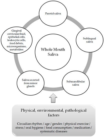 The term “whole mouth saliva” (WMS) is used in oral sciences to determine the transparent, clear, watery fluid composed by a mixture of the parotid saliva, the submandibular saliva and the sublingual saliva, combined with the secretions of minor salivary glands, the gingival crevicular fluid, eukaryotic cells (epithelial as well as leukocytic), food debris, microorganisms and their metabolites [4,5,6].