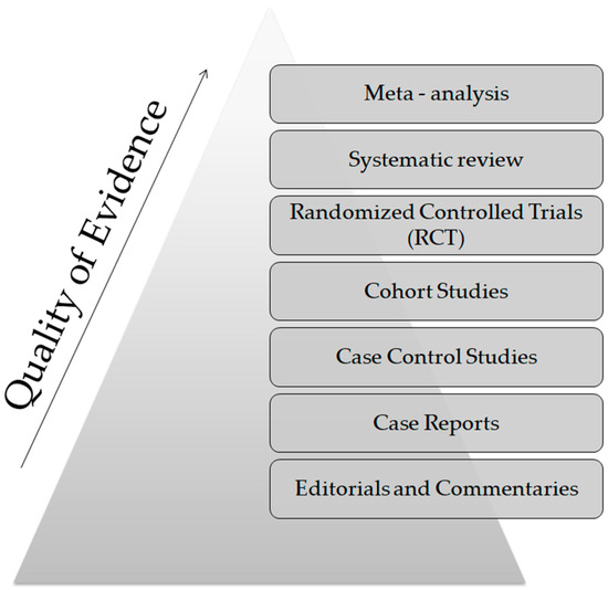 From a technical point of view, several analytical platforms are developed and integrated into the human saliva metabolomic profiling process. The two most renowned metabolite measurement technologies are nuclear magnetic resonance spectroscopy (HNMR) and mass spectrometry (MS) [20,23,24,37,38]. Subcategories of MS methods or additional combinatorial/conjunctive methods are mentioned below. Capillary electrophoresis time-of-flight mass spectrometry (CE-TOF-MS), gas-chromatography mass spectrometry (GC-MS), direct flow injection—liquid chromatography mass spectrometry (LC-MS), inductively coupled plasma mass spectrometry (ICP-MS) and high performance liquid chromatography (HPLC) [23,39,40]. Τhe description of each analytical platform is outside the scope of this mini-review. NMR is characterized as an untargeted metabolomics technique that leads to the identification and quantification of compounds, including short-chain organic acids, amino acids, alcohols, amines, sugars and pharmaceutical adjuvants. The advantage of this technique focuses on the minimal or no sample pre-treatment needed (deproteinization by centrifuging) and on its higher reproducibility compared to MS analytical platforms [41]. On the other hand, MS is an analytical method of high sensitivity, that identifies and/or quantifies a substance by measuring its mass and number of ions by the use of various ionization methods [42]. The combination of MS with other conjunctive methods has the advantage of greater metabolite identification even at lower concentrations [43,44,45]. The use of complex extraction methods and separation steps in order to detect and analyze both polar and non-polar organic acids is highlighted as a difficulty that complicates the identification procedure by mass spectrometry [41]. MS-based metabolomics require a well-designed pooled quality control sample (PQC) that is repeatedly analyzed throughout the sample batch and used for signal corrections compared to NMR-based metabolomic analysis [18,46]. Those characteristics are mentioned in order to understand that an additional limitation in salivary metabolomic studies exists due to the complexity of the analytical instruments used. Most studies only use one analytical platform and try to analyze one individual metabolome, which makes a potential comparison of salivary metabolic profiles between studies using different analytical technologies insignificant. At this point the allusion to the term “standard operating procedure” is of utmost importance (Figure 2). This term refers to the standardization and enactment of specific workflows as to the pre-analytical, analytical and post-analytical methods used [47,48]. The standardization of sample collection (for example, the use of unstimulated WMS in all studies), sample storage conditions (freezing temperatures), sample pretreatment (centrifugation for cell content removal and/or additional separation steps), sample analysis (by the use of more than one analytical platform) and statistical methods employed (principal component analysis—partial least-squares regression) would minimize the heterogeneous results in salivary metabolomic coverage [13,25,26], caused by separation difficulties, sensitivity differences, instrument detection differences, compound stability, solubility, and volatility [23,49,50], and give the opportunity to conduct comprehensive systematic reviews and meta-analyses, which are placed on top of the evidence-based science pyramid (Figure 3). Scientific studies are categorized based on the quality as well as the amount of evidence available, meaning that towards the base of the pyramid, the amount of evidence increases but simultaneously the quality of the evidence decreases.