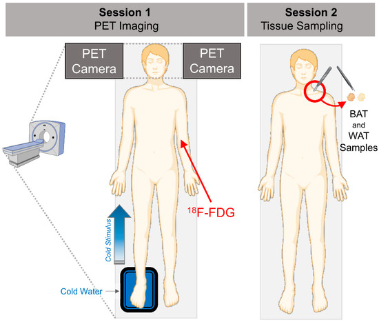 In session 1, PET scanning using an 18F-FDG radiotracer was conducted with cold water foot immersion to give cold stimulus to the participants. In session 2, an excision biopsy of the fat from the supraclavicular neck region was obtained.