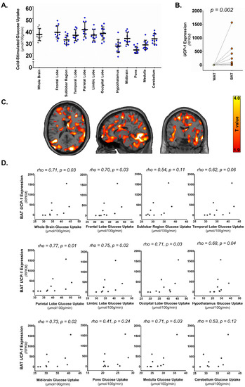 In our previous publication by Orava et al. (2014), we have shown that cold stimulation increases BGU, and it correlates positively with cold-stimulated BAT GU [14]. Thus, in the present investigation, we pursued to assess whether BAT’s thermogenic capacity, as indicated by the expression of UCP-1, is also associated with BGU. Indeed, we found a direct relationship between cold-stimulated BGU and UCP-1, suggesting that not only are the two tissues metabolically linked during cold stress [14] but also that brain metabolism under mild cold stress is linked with BAT capacity to generate heat in healthy adults. The brain areas significantly associated with UCP-1 expression of BAT are shown in Figure 2C and are listed in Table 2, including the frontal, parietal, limbic, and occipital lobes, as well as the hypothalamus, midbrain, and medulla.