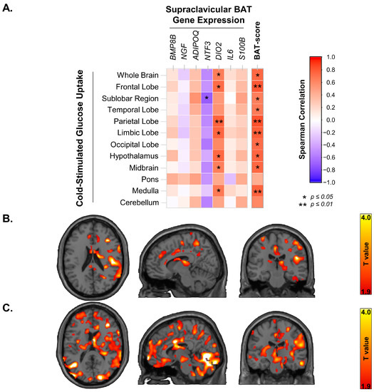 (A) The relationship between the expressions of genes in supraclavicular BAT—that may influence brain metabolism via proteins encoded by them—and brain glucose uptake in mild cold stress. The relationship between BAT-probability score—based on the transcriptional profile of supraclavicular BAT sample, and cold stimulated brain glucose uptake. (B) Statistical parametric mapping (SPM) images of the association between brain glucose uptake (BGU) during cold conditions and BAT DIO2 expression. p values < 0.05 cluster level; p values < 0.05 voxel level; extend threshold k = 3031 voxels; FDR-corrected. Higher T values denote stronger associations (coloured bar at the side) (C) Statistical parametric mapping (SPM) images of the association between brain glucose uptake (BGU) during cold conditions and BAT-probability score. p values < 0.05 cluster level; p values < 0.05 voxel level; extend threshold k = 114 voxels FDR-corrected. Higher T values denote stronger associations (coloured bar at the side).