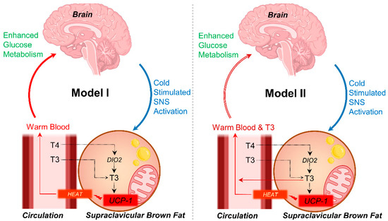 The relationship between the expression of DIO2 in BAT and cold-stimulated BGU is also of significant interest. DIO2 catalyses the transformation of the pre-hormone thyroxine (T4) to 3,5,3′-triiodothyronine (T3). In humans, DIO2 is expressed in the brain, BAT, uterus, placenta, thyroid gland, and heart. Under normal conditions, the primary circulating thyroid hormone is T4, and DIO2 contributes largely to circulating T3 and fulfills the intracellular needs of thyroid hormones. Considering the location of BAT is in close proximity to the brain, and the finding of a positive link between BAT expression of DIO2 and BGU, it is tempting to speculate that the increased expression of DIO2 in BAT may serve to provide T3 to the brain, along with the warm blood (Figure 4). This mechanism could be essential for supporting the T3 needs of the brain during cold stress [26] via circulation [27,28] or providing thermogenic feedback communication to the brain [29]. Previous studies have shown that T3 mediates glucose metabolism in brain astrocytes, as the primary cultures of rodents devoid of L-T3 have low rates of 2-deoxyglucose uptake [30], and when astrocytes are replenished with L-T3 the 2-deoxyglucose uptake is enhanced, increasing the binding sites of the glucose transporter [31]. As 18F-FDG uptake in the brain is mainly driven by astrocytes rather than neurons [32], it is possible that systemic DIO2 expression plays a role in regulating BGU, particularly in the challenging situation of mitigating hypothermia. However, it cannot be ruled out that T3 generated by BAT could be merely to support UCP-1 activation [33,34,35], or it may also act as a communication feedback loop between BAT and the brain to regulate thermogenesis. In the same context, López et al. (2010) have noticed that central administration of T3 in rats leads to the activation of SNS and BAT. Also, in humans, we have noticed that hyperthyroidism leads to upregulated BAT metabolism [36]. The plausibility of the co-occurrence of these mechanisms also exists.