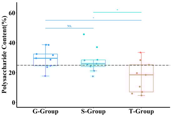 The effects of different cultivation methods on polysaccharide content (n = 9). Each point represented one sample. The G-Group meant that the sample was from greenhouse cultivation; S-Group meant that the sample was from stone epiphytic cultivation; T-Group meant that the sample was from live tree epiphytic cultivation. The dotted line indicated the polysaccharide content was equal to 25%. Furthermore, * represented p < 0.05, and NS represented that there was no statistical difference.