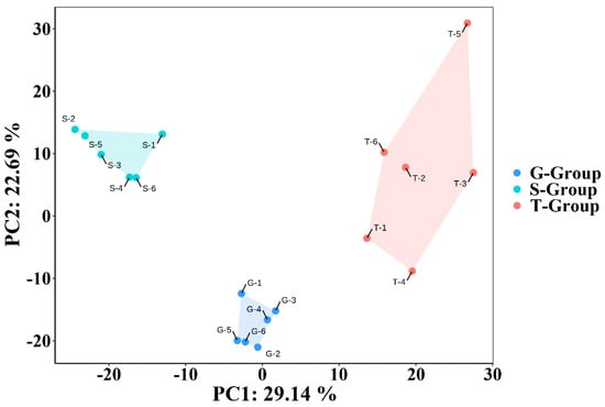 The effects of different cultivation methods on the metabolite profile (n = 6). PCA was used to analyze the data. The contribution of PC1 was 29.14% and that of PC2 was 22.69%. Each point represented one sample. G-Group meant that the sample was from greenhouse cultivation; S-Group meant that the sample was from stone epiphytic cultivation; T-Group meant that the sample was from live tree epiphytic cultivation.
