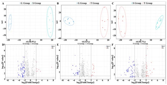 The effects of different cultivation methods on the metabolites (n = 6). A supervised OPLS-DA model was used to compare the data. The G-Group meant that the sample was from greenhouse cultivation; S-Group meant that the sample was from stone epiphytic cultivation; T-Group meant that the sample was from live tree epiphytic cultivation. In (A–C), the x-axis represents the predicted principal component and the y-axis represents the orthogonal principal component. Each point represents one sample. (A) compares the samples from greenhouse cultivation and stone epiphytic cultivation with parameters R2X: 0.483, R2Y: 0.997, and Q2: 0.93. (B) compares the samples from greenhouse cultivation and live tree epiphytic cultivation with parameters R2X: 0.527, R2Y: 0.986, and Q2: 0.916. (C) compares the samples from stone epiphytic cultivation and live tree epiphytic cultivation with parameters R2X: 0.511, R2Y 0.991, and Q2: 0.936. (D–F) includes the volcano plots which were used to show the differences in metabolites between the groups. The screening criteria were set to satisfy the conditions of VIP value >1, fold change >4, and p < 0.05. The blue dots in the graphs indicate that the metabolite contents were significantly down-regulated. The red dots indicate that the metabolite contents were significantly up-regulated. The grey dots indicated that the metabolite contents were not significantly changed.