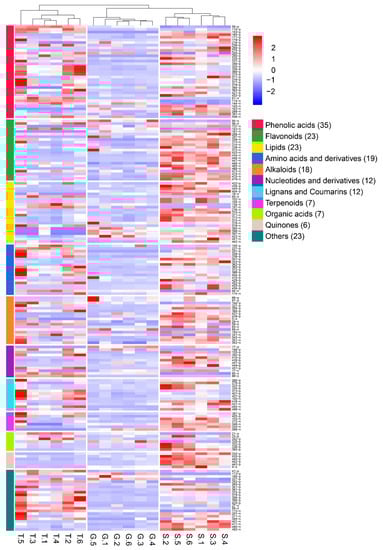 The effects of different cultivation methods on the contents of the changed metabolites (n = 6). The heat map was used to describe the changes in the metabolite contents. G meant that the sample was from greenhouse cultivation; S meant that the sample was from stone epiphytic cultivation; T meant that the sample was from live tree epiphytic cultivation. On the left side of the graph, the color was used to show the classification of the metabolites. On the right side of the graph, the number of the metabolite was listed. N meant that the determination was in negative ion mode, and P meant that the determination was in positive ion mode. Re-ID is a ranking of compounds based on their molecular weight and the results of positive and negative ion scanning patterns. In the graph, the red color represents an increase in metabolite content and the blue color represents a decrease in metabolite content.
