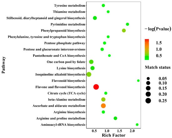 Metabolites were annotated and imported into Metabo Analyst 5.0 for KEGG metabolic pathway enrichment analysis. The top twenty enriched metabolic pathways were presented as enrichment bubble plots, as shown in Figure 6. Within these pathways, there are four carbohydrate metabolic pathways, five secondary metabolite synthesis pathways, six amino acid metabolic pathways, one nucleotide metabolism pathway, three cofactor and vitamin metabolism pathways, and one translation pathway in genetic information processing. The flavone and flavonol biosynthesis pathways were affected most by the three cultivation methods due to the highest degree of enrichment and the greatest number of changed metabolites.