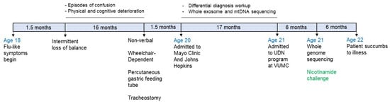 A metabolic profile of the patient’s plasma revealed the absence of 1-methylnicotinamide and low N1-methyl-2-pyridone-5-carboxamide, two biochemical intermediates formed during the metabolism of nicotinamide into NAD(H) via the salvage pathway. Related metabolic compounds showed no obvious abnormalities, and his acylcarnitine and amino acid profiles were normal. A previous dose of NADH did not appear to have affected the patient’s condition. In attempts to further characterize the patient’s suspected defect in nicotinamide metabolism, one of the UDN physicians traveled to the patient’s home to perform a nicotinamide challenge. It had now been three and a half years since the patient first fell ill. By this time, he was completely bedridden with spastic reflexes and contractures. He required round-the-clock care, which his family provided to the highest degree of excellence. To perform the nicotinamide challenge, the patient was subjected to a 4-h fast and then immediately challenged with a 500 mg liquid bolus of nicotinamide. Plasma samples were collected: (1) under normal fed conditions, (2) immediately following the fast, and (3) 8 h after the challenge. Global metabolic profiling of those plasma samples revealed an error in metabolism related to nicotinamide N-methyltransferase (NNMT) activity. A reexamination of his WGS data did not show any candidate NNMT variants. Sadly, by the time this error of metabolism was discovered, the patient’s condition had deteriorated considerably. He died in March 2022, approximately four years after the onset of his illness. In the several hours leading up to his death, he experienced tachycardia to the 150–170 level, which gave way to cardiac arrest. There was no apparent sepsis, and the patient did not experience oxygen desaturation. Even though our findings did not lead to a conclusive diagnosis they did reveal metabolic defects that may have contributed, either directly or indirectly, to the patient’s complex disease. Our motivations for presenting the findings of this global profiling study are to ensure that this information will be available in the rare disease literature for future reference and to show the impact that metabolomics can have on characterizing rare metabolic diseases for both diagnostic and research purposes.