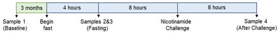 As shown in Figure 2, the first whole blood sample (baseline) was collected from the patient under normal fed conditions three months before the metabolic profiling study was conducted. On the day preceding the study, the patient was subjected to a 4-h fast, and two paired whole blood samples were taken immediately following the fast. The next day, after the normal diet had resumed, the subject was given a 500 mg bolus of liquid nicotinamide through his gastric feeding tube to initiate nicotinamide metabolism. The last blood sample was taken 8 h after the challenge. All blood samples were collected into EDTA tubes by a trained phlebotomist. Plasma was isolated from whole blood by centrifugation and stored at −80 °C until analysis according to Metabolon’s sample handling protocol [20].