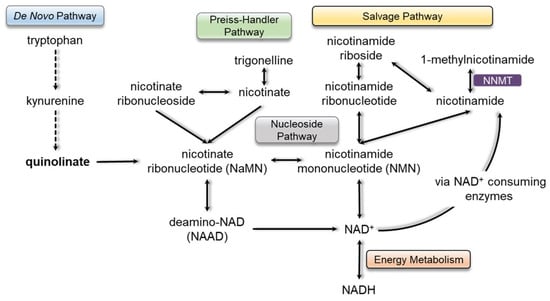 NAD(H) is synthesized through three different pathways: the de novo, Preiss-Handler, and salvage, which start with tryptophan, nicotinate, and nicotinamide, respectively. Normally, in mammalian cells, NAD(H) synthesis primarily occurs through the salvage pathway [16]. Here, nicotinamide is converted to either 1-methylnicotinamide by the enzyme nicotinamide N-methyltransferase (NNMT) or to nicotinamide mononucleotide (NMN) by nicotinamide phophoribosyltransferase (NAMPT). NMN is then conjugated to ATP and converted to NAD(H) by NMN adenylyltransferase (NMNAT). The salvage pathway is coupled with several NAD+-consuming enzymes, including poly (ADP-ribose) polymerases (PARPs), sirtuins, CD38, CD157, and SARM1 [17]. These enzymes consume NAD+ to catalyze several reactions, including ones that generate nicotinamide. With the generation of nicotinamide, the salvage pathway can start over again.