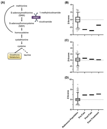 Methionine was absent in the patient’s plasma at baseline and after fasting (Figure 6B), but the nicotinamide challenge restored methionine levels to the low normal range (7th percentile). This suggests that the reduced function of NNMT under baseline and fasting conditions impaired the conversion of SAM to SAH. This would then impair the conversion of homocysteine back to methionine. Interestingly, cystathionine, the metabolite directly downstream of homocysteine, was within the normal range at all three time points (Figure 6C). Cysteine, which is immediately downstream of cystathionine, was significantly elevated (p < 0.05) at all time points (Figure 6D). These data further suggest that NNMT function was minimal at baseline and that its function was restored in response to a nicotinamide bolus, resulting in a correction of metabolic pathways affected by low NNMT activity.