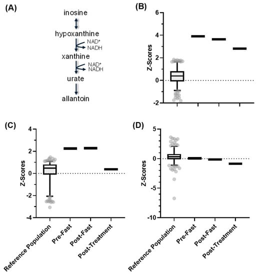 (A) Purine metabolic pathway (through inosine), along with the Z-scores for the healthy reference population in comparison to the pre-fast, post-fast, and post-treatment Z-scores for the patient for (B) inosine, (C) hypoxanthine, and (D) xanthine. The box represents the 1st and 3rd quartiles, with the median indicated by a line within the box. The whiskers represent the top 97.5th and bottom 2.5th percentiles of the reference range. Individual values within the reference population (N = 866) outside these percentiles are indicated with circles.