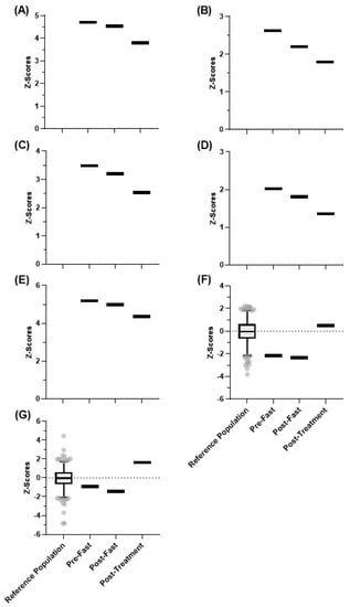 Z-scores for the healthy reference population in comparison to the pre-fast, post-fast, and post-treatment Z-scores for the patient for (A) stearidonate, (B) docohexaenoate, (C) docopentaenoate, (D) linolenate, (E) eicosapentaenoate, (F) cortisol, and (G) cortisone. The box represents the 1st and 3rd quartiles, with the median indicated by a line within the box. The whiskers represent the top 97.5th and bottom 2.5th percentiles of the reference range. Individual values within the reference population (N = 866) outside these percentiles are indicated with circles.