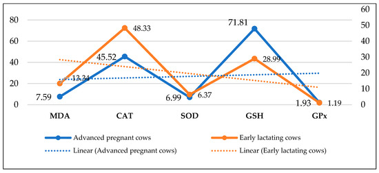 In oxidative damage prevention or removal, antioxidants play an important role [53,54]. By protecting the body from free radicals, antioxidants play an important role. There are two types of defense systems: enzymatic and non-enzymatic. Among the enzymes are SOD, glutathione peroxidase (GPx), and CAT, while the non-enzymatic vitamins are C, E, and selenium [55,56]. A weak antioxidant defense occurs when reactive oxygen species and free radical production increase greatly. By reducing antioxidant defenses, biological molecules and normal physiological and metabolic functions are damaged. The formation of reactive oxygen species occurs naturally in living organisms due to the release of free radicals. Normally, prooxidants and oxidants balance each other, but when the equilibrium is disturbed, harmful effects result. In cattle, oxidative stress occurs due to a decrease in antioxidant levels near the time of parturition [57,58]. Figure 1 shows the oxidative stress and antioxidant status in advanced pregnant and early lactating cows [59].