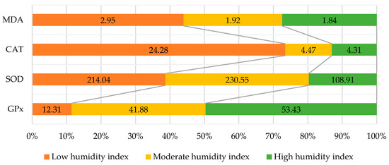 When different tissues do not function as they should, malondialdehyde (MDA) is the best indicator of reactive oxygen species and the most effective detector for free radicals of oxygen [27]. The main function of the superoxide dismutase enzyme (SOD) is to change the superoxide radical into an oxygen molecule and water [28]. In the following reaction, oxygen and water are transformed from hydrogen peroxide to water and oxygen by catalase and peroxidase. Cells use catalase (CAT) to catalyze the breakdown of water into molecules of water and less reactive oxygen gas [29]. Oxidative stress can result from disturbances in antioxidant balance [30]. This type of imbalance can lead to a variety of disorders [31,32,33].