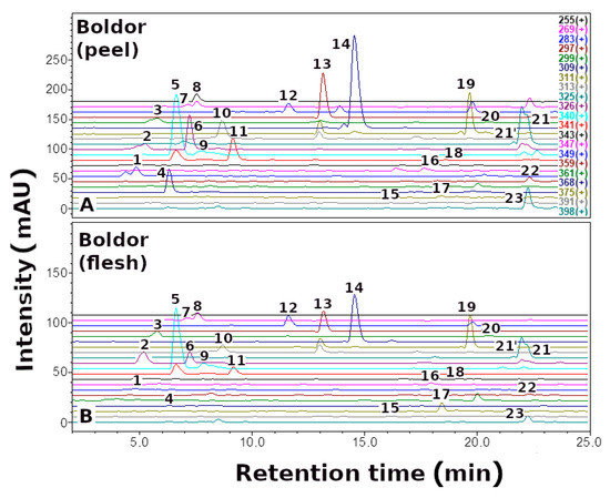 Selected-ion monitoring chromatogram (ESI-MS) in positive ion mode for betaxanthins of yellow Beta vulgaris L.: (A) peel, and (B) flesh. Numbers and names are available in Table 1.