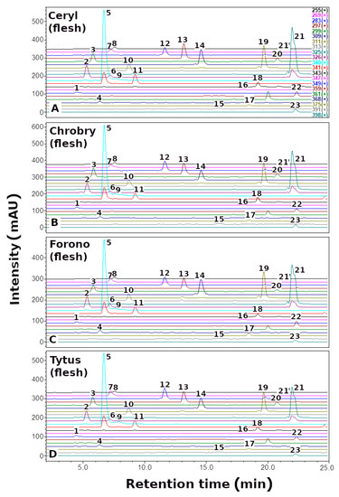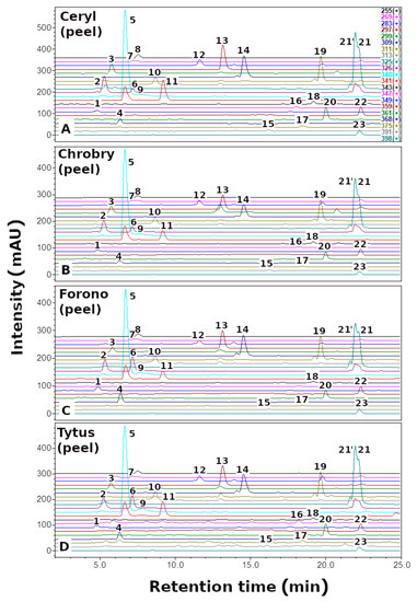 Here, we report the quantitative and qualitative (Figure 2, Figure 3 and Figure 4, Table 1) profile of betaxanthins of the peel and flesh extracts of four red (Ceryl, Chrobry, Forono, Tytus) and one yellow (Boldor) Beta vulgaris L. cultivars. These are popular edible beet cultivars.
