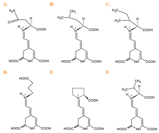 Predominant betaxanthins detected in Beta vulgaris, L. cultivars: (A) glutamine-Bx (5), (B) leucine-Bx (21), (C) isoleucine-Bx (21′), (D) γ-aminobutyric acid-Bx (13), (E) proline-Bx (14), (F) valine-Bx (19).